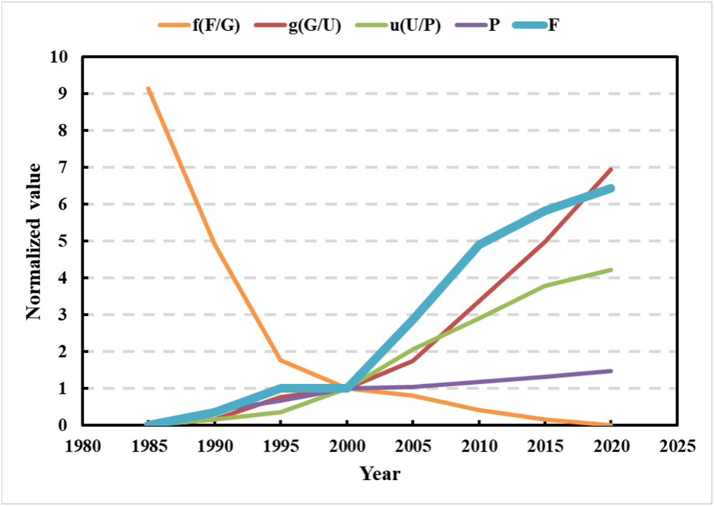 图3. 全国碳排放因果方程 (F-全国碳排放量,P-全国总人口,U -全国不透水面面积,G-全国GDP总量)