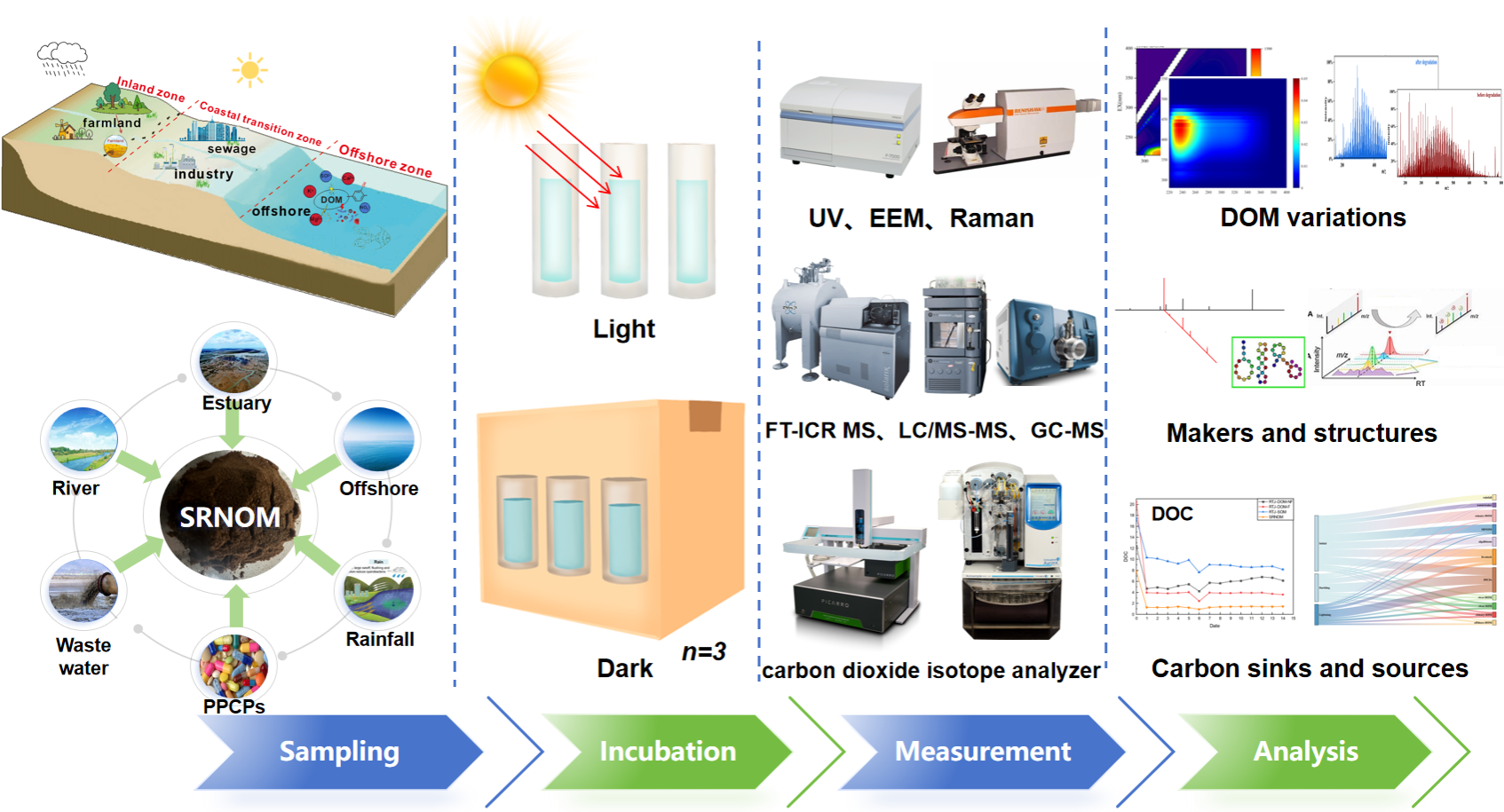 我院流域生物地球化学循环研究中⼼戚羽霖教授课题组对环渤海地区海陆界面以及降雨、污水排放、污染物释放等特殊事件影响下的有机碳降解规律展开研究。通过室内实验并结合光谱、色谱、质谱和同位素等手段,量化了海河流域有机碳的激发效应,并揭示了激发效应导致的有机碳来源、分子组成和结构的变化规律。研究结果显示: