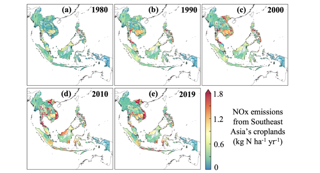 氮氧化物(NOx)是大气中重要的污染物之一,在臭氧和细颗粒物(PM2.5)的形成中扮演关键角色,对生态系统和人体健康有害。尽管东南亚地区通过政策调控限制了燃烧源的NOx排放,但随着农业生产的快速发展,农田施肥导致的NOx排放问题日益突出。东南亚地区是全球重要的农业生产区,过去40年间,该地区的农作物产量显著提升,但氮肥利用效率低于50%,导致大量氮肥通过土壤排放进入大气,成为NOx的重要来源。然而,目前关于东南亚农田NOx排放的量化研究仍存在较大的不确定性,尤其是缺乏作物特定和高时空分辨率的排放数据。