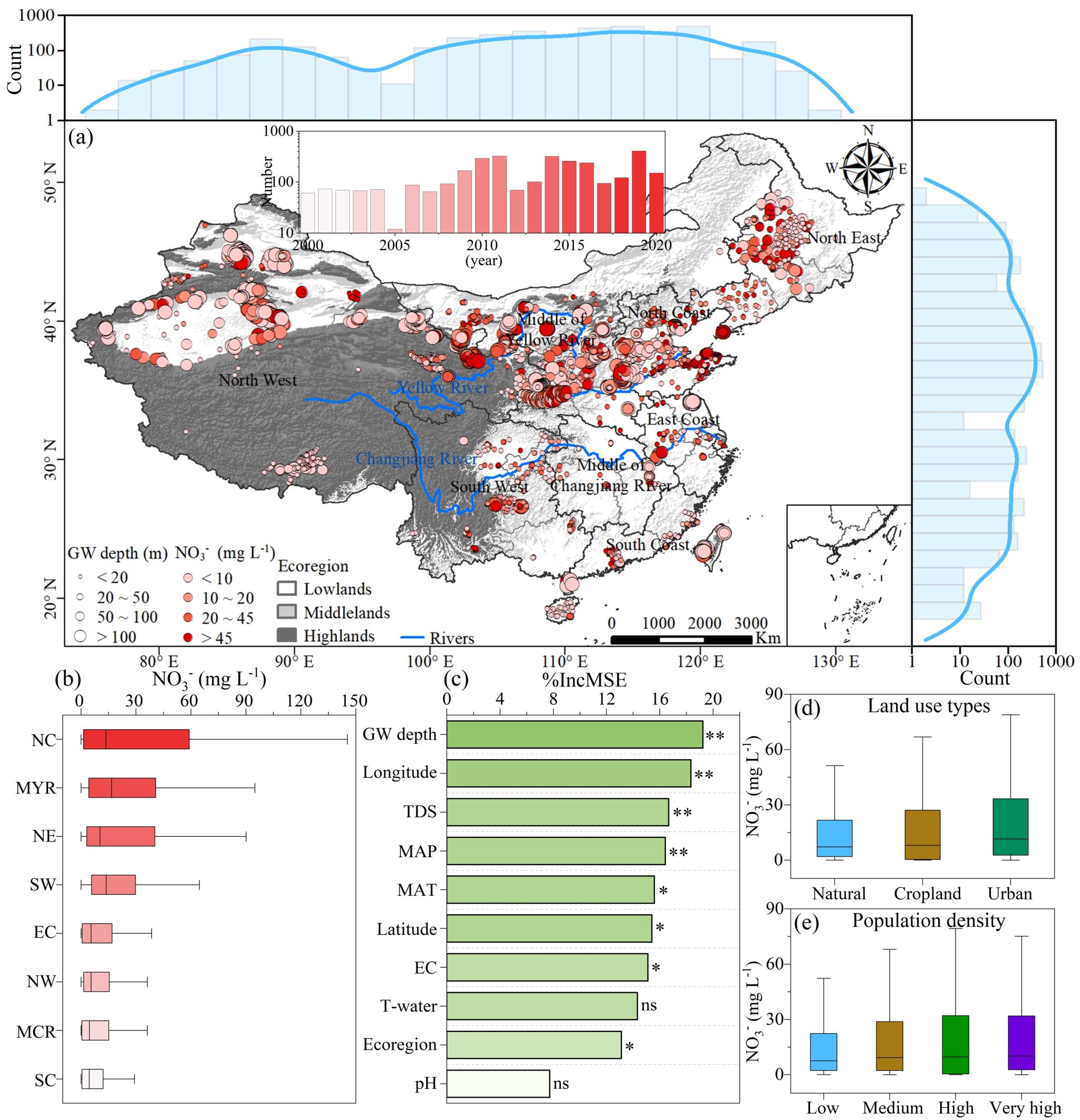 氮污染已成为全球地下水质量恶化的主要环境问题之一,尤其在农业集中区,长期的大量施肥和污水排放导致活性氮不断渗入地下水系统。中国作为全球氮肥施用量较多国家,其地下水中硝酸盐浓度的空间分布格局以及与气候条件、地理因素和人类活动如何相互作用影响地下水中氮素浓度,有待深入研究。