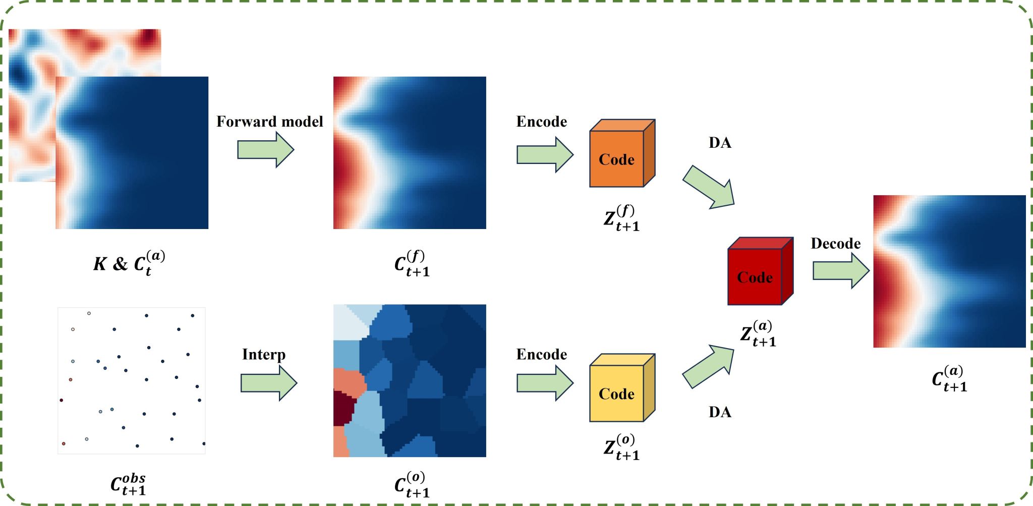 (2)针对地下水模型预测精度常受参数异质性及初始条件不确定性影响,导致误差随时间累积问题。提出一种耦合深度学习代理模型与潜空间数据同化(LDA)的新框架,在降维后的潜空间中实现同化算法,有效规避高维系统同化中的“维数灾难”。