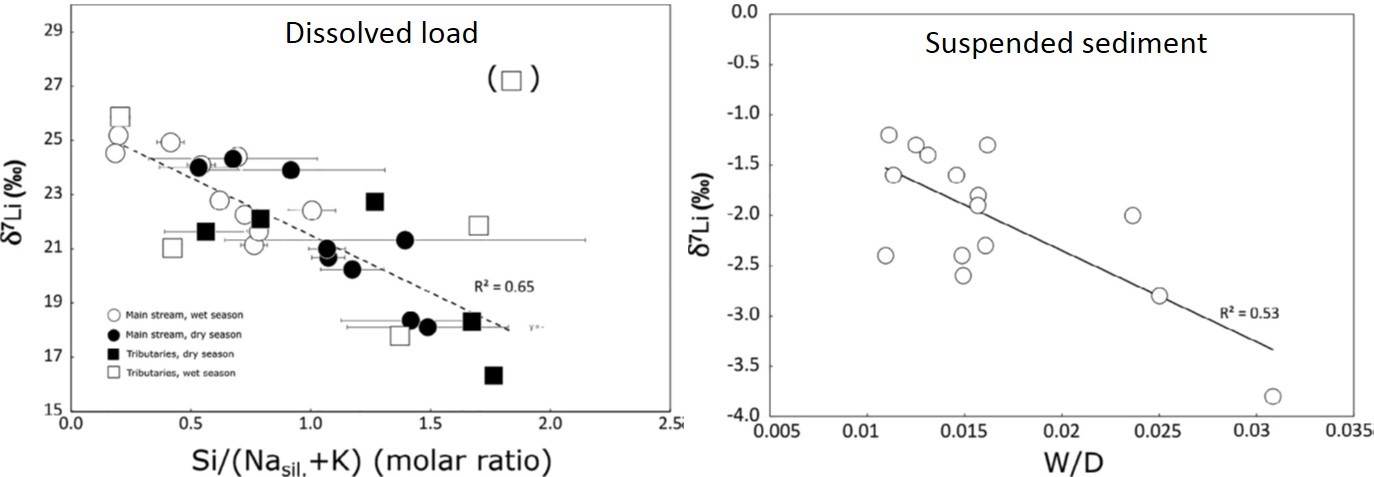 陆地岩石风化被认为是大气二氧化碳的重要碳汇过程,尤其是在超过十万年的地质时间尺度,硅酸盐岩风化作为一种长期稳定的碳汇(净碳汇)成为维持地表气候长期稳定负反馈机制的关键环节。近几十年来,锂(Li)同位素已被逐渐证实是一种良好的硅酸盐岩风化示踪代用指标,在示踪陆地硅酸盐岩风化过程、陆地风化机制演化等方面取得一系列重要认识。海洋沉积记录表明,自新生代以来海水Li同位素上升了约9‰,然而目前对海水Li同位素这种演化趋势的解释仍存在争议。作为海洋Li的主要来源之一,陆地硅酸盐岩风化的深入研究为阐明海水Li同位素演化过程提供了重要启示,因此对陆地大河流域的相关研究至关重要。然而,近些年来人为活动的加剧(如筑坝以及对河水流量的季节调控等)显著改变了河流体系的水动力状态,从而影响河流携带物由陆地向海洋的传输,进而对利用河流中Li同位素组成(δ7Li)示踪流域风化过程产生了潜在影响。