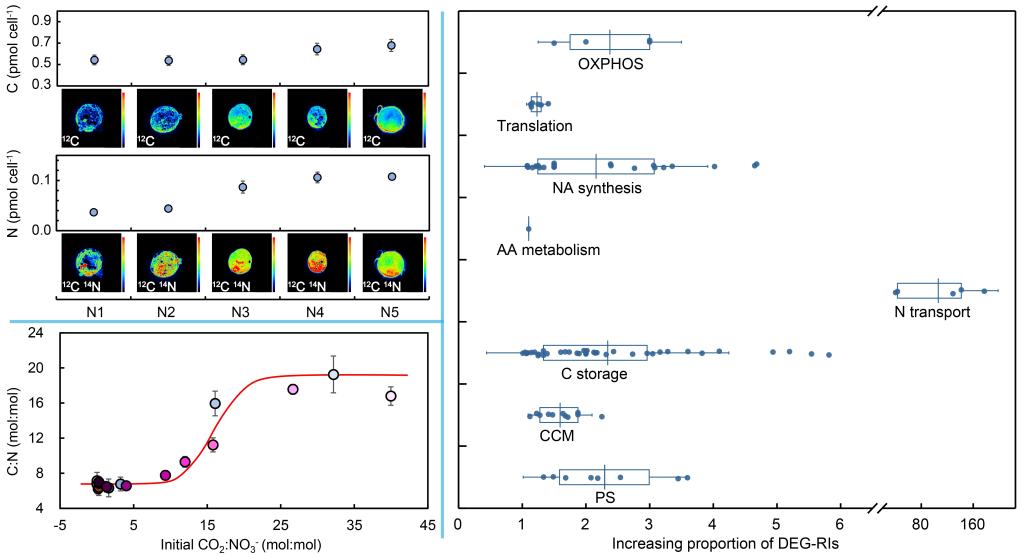 结果发现CO2限制对浮游植物C:N比无显著影响;但氮限制则导致水库中浮游植物C:N比提高了35%,室内衣藻C:N比提高了138%。CO2限制时,藻类通过碳浓缩机制保证了细胞的碳需求,相关基因无显著差异表达,胞内碳氮耦合代谢正常。但在氮限制时,差异表达基因调控强度大幅增加,增加的倍数与细胞C:N比的增幅相当;细胞代谢过程被重组以形成高C:N比下的“亚健康”碳氮计量状态。此外,氮转运系统在CO2或氮限制条件下有独特的作用。本研究表明浮游植物的化学计量内稳态受生境中对其生长有限制作用的元素的影响,进一步加深了对淡水浮游植物碳氮化学计量内稳态的理解。