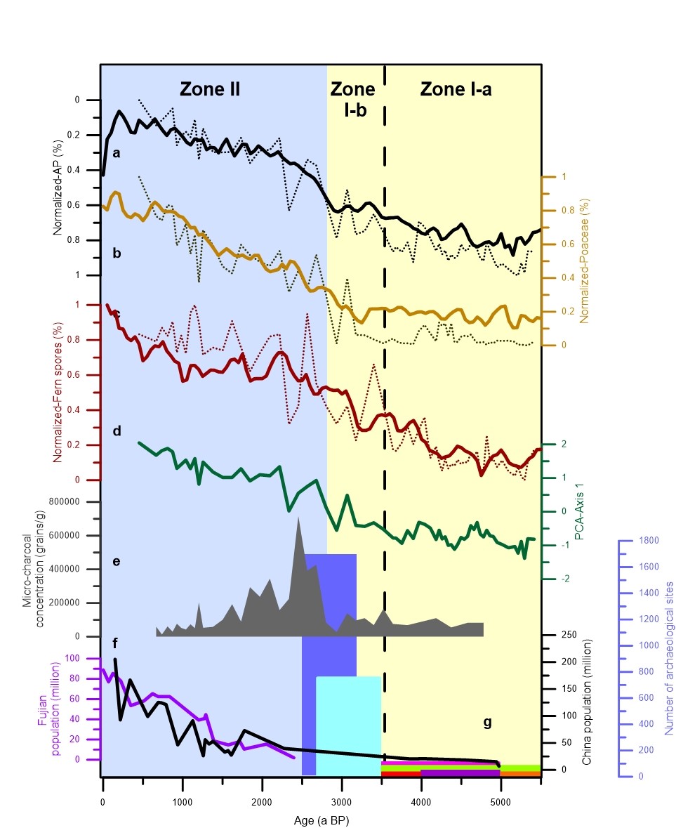 距今~2,800年前大致对应于中国历史上西周晚期向春秋过渡时期;该期副热带东亚地区考古遗址点大量增加说明此时人类的生活方式、社会复杂性和人口等方面都发生了巨大的改变。随着人口增长和农业的快速发展(如稻作农业的传播),农耕经济逐渐取代了渔猎文化而占据主导地位。出土的灰陶、几何印纹硬陶以及原始瓷等标志着陶瓷手工业的兴盛,这可能促进了对森林的砍伐并加剧了火灾事件的发生频次,蒋山泥炭炭屑浓度在这一时期达到峰值印证了这一推测。