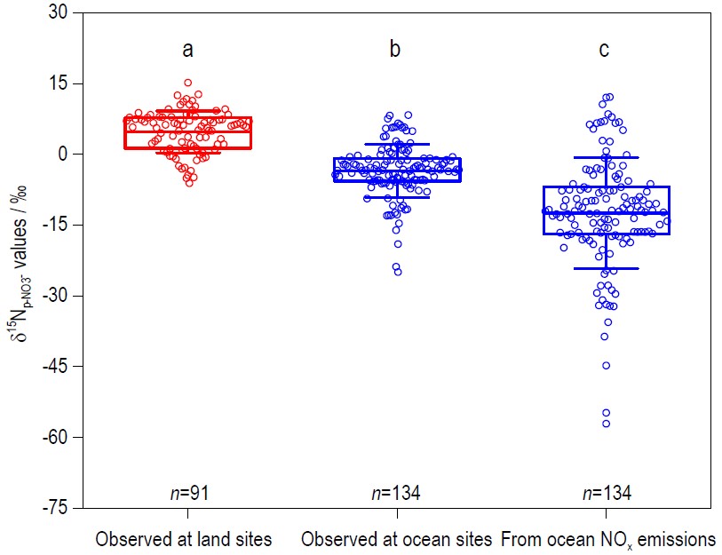 图一、陆地和海洋大气颗粒物NO3-氮同位素观测值以及来自海洋NOx排放贡献的大气颗粒物NO3-的氮同位素值