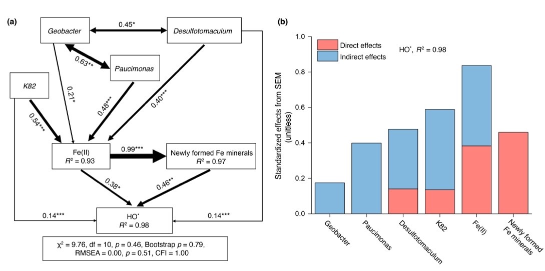 天津大学地科院余光辉教授利用长期定位施肥土壤富集微生物群落,探究了微生物群落-铁矿物协同驱动土壤泥浆中羟基自由基形成的途径和机制。研究发现,微生物和铁矿物协同驱动了土壤泥浆中羟基自由基的形成;培养21天后,培养体系中羟基自由基浓度可达100 nM。借助化学分析、同步辐射、高通量测序、随机森林和结构方程模型等分析手段和统计方法,研究发现微生物可通过调控超氧离子直接影响羟基自由基形成,也可通过驱动铁矿物转化而间接调控羟基自由基产生。其中,微生物驱动的铁矿物氧化还原转化是土壤泥浆中羟基自由基形成的主控因子;Geobacter, Paucimonas, Rhodocyclaceae_K82和Desulfotomaculum是土壤中控制羟基自由基产生的关键微生物属。该发现对全面认识表层地球系统中活性氧的形成途径具有重要意义,也可为深入理解氧化还原波动环境中碳周转和养分循环提供新认识。