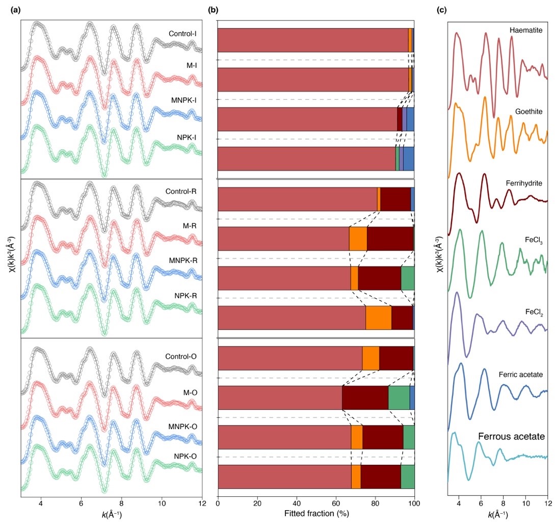 图1. 同步辐射扩展X射线吸收精细结构 (EXAFS)谱表明了微生物介导的铁矿物转化过程