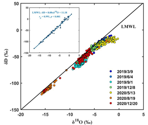 作为有效的天然示踪剂,水稳定同位素组成(例如,δD、δ18O和水线氘差lc-excess)为解析陆-气界面水分交换过程、识别植被耗水水分来源等提供了关键依据,然而当前对其时空分布规律仍缺乏了解,进而为解译土壤水稳定同位素数据带来极大的不确定性。