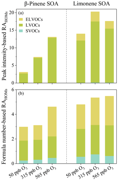 1 不同臭氧浓度条件下形成β-蒎烯SOA和柠檬烯SOAHOMs挥发性的相对丰度