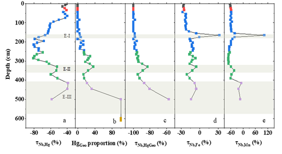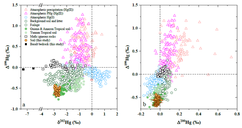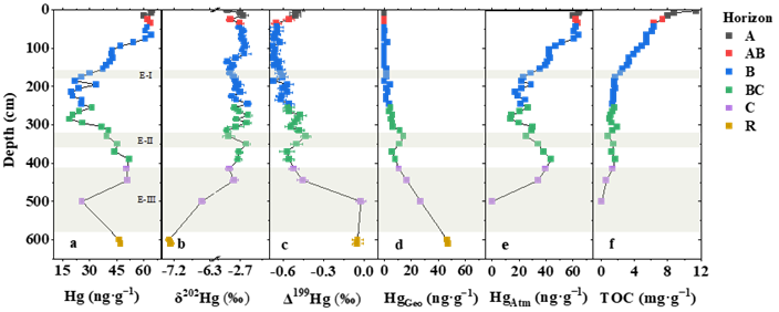 1) 大气汞沉降是整个砖红壤剖面的主要汞源,而基岩风化残余的地质源汞贡献较少(0–36%)。整个剖面呈现非常负的非质量分馏值(Δ199Hg,负达~ −0.6‰),表明大气源汞在土壤表面发生了显著的光还原再释放。剩余大气源汞通过淋溶等作用向下迁移,并与土壤有机质的分布耦合。