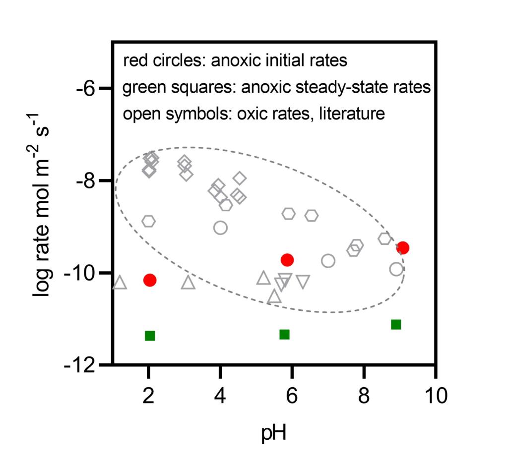 图2 毒砂溶解速率随pH的变化,实心带颜色点为无氧溶解速率,空心点为有氧溶解速率