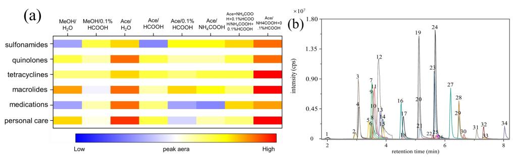 图1: (a) 不同流动相体系下PPCPs的色谱响应值热图;(b) 34种混标PPCPs的色谱分布图