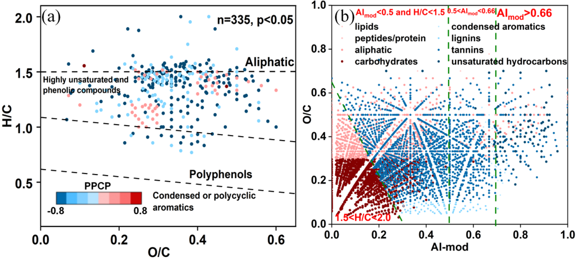 图3:(a) 单个分子与PPCPs浓度的显著Spearman等级相关系数 (p<0.05);(b) O/C与AI-mod值分布图