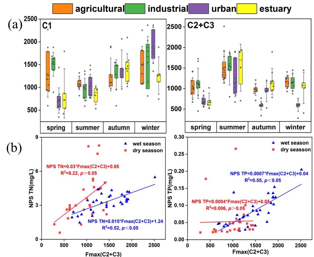 图2: (a) 海河海域DOM荧光成分Fmax值的时空变化,其中C1代表点源污染,C2+C3代表非点源污染;(b) 腐殖质样物质DOM荧光强度与NPS TN/NPS TP污染负荷的关系