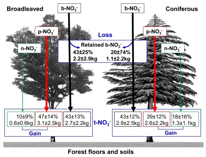 刘学炎等通过构建新的氮氧同位素(15N, 17O, 18O)方法和对全球数据综合分析,发现穿冠水对冠层硝化作用(n-NO3-)和颗粒物硝酸根(p-NO3-)的捕获(Gain)总体高于林冠截留或吸收导致降水原始硝酸根的损失(Loss),这是导致穿冠水硝态氮(t-NO3-)沉降通量总体高于开阔地总降水硝态氮(b-NO3-)沉降通量的原因,表明不考虑冠层氮交换总体会低估森林土壤的大气氮输入。另外,大气硝态氮污染程度会促进降水-冠层硝酸根交换过程通量,阔叶树冠和针叶树冠的硝态氮生物地球化学过程差异和机理需要更多观测检验。这些发现有助于森林氮循环及其对碳循环等功能影响的评估和森林生态环境管理的优化。