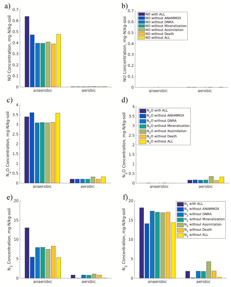 通过对实际农田土壤培养实验数据的模拟和验证,MEMCN模型很好地重现了NH4+、NO3-、NO2-、NO、N2O和N2的动态变化。此外,模拟结果显示,除硝化和反硝化过程外,ANAMMOX和微生物同化过程对控制农业土壤中的氮转化最为重要。在厌氧条件下,ANAMMOX在模拟开始时(即48小时)直接增加了139%的N2排放;而在好氧条件下,微生物同化在模拟结束时(即336小时)间接降低了88%的NO、54%的N2O和58%的N2排放。相应地,在厌氧条件下,厌氧氨氧化菌的生物量在模拟开始时显著增加;而在好氧条件下,亚硝酸盐氧化菌的生物量显著增加。相比之下,DNRA、矿化和微生物死亡等过程对土壤氮转化的影响较小,在模拟过程中DNRA细菌和异养微生物的生物量没有显著变化。模拟结果表明,有必要在土壤氮模型中加入ANAMMOX和微生物同化过程,而只有在微生物生物量发生显著变化时才需要采用微生物显式模型。