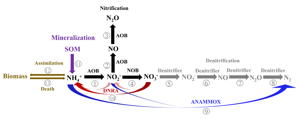 天津大学地科院晏智锋课题组构建了一种新的微生物显式模型(Microbial-Explicit Model incorporating Comprehensive Nitrogen processes, MEMCN),该模型综合考虑了氮循环的各个过程,包括硝化、反硝化、厌氧氨氧化(ANAMMOX)、异化硝酸盐还原铵(DNRA)、矿化和微生物同化(即生长)和死亡(图1),旨在评估和量化各种氮过程对气态氮(N2O、NO和N2)产生的影响。