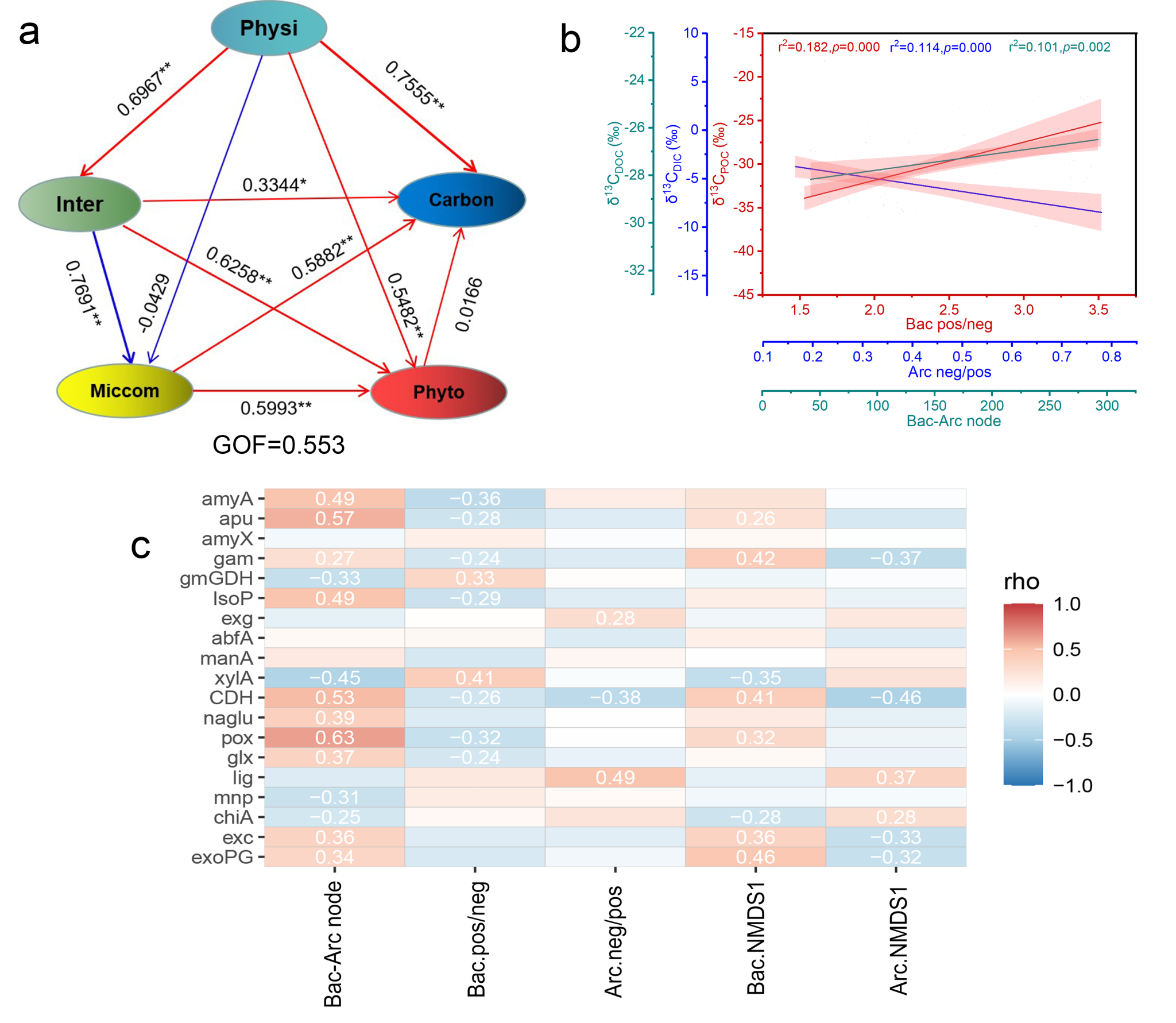图2 有机碳转化及降解的影响因子。(a)理化参数、微生物互作、微生物结构组成对碳同位素组成差异影响的PLS-PM模型分析;(b)微生物互作对碳同位素组成的影响;(c)微生物互作与碳降解基因的相关性分析。