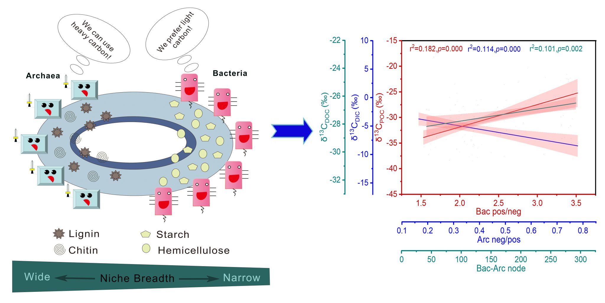 结果发现,滨海湿地细菌主要由窄生态位的特异种构成,而古菌具有宽生态位的中性种和泛化种的分化;生态位的差异促使细菌与古菌共存。细菌偏好轻有机碳的降解(如淀粉、半纤维素),而古菌具有重有机碳(如纤维素、木质素和几丁质)降解的能力。种间竞争与合作共存,但以合作为主。细菌之间的合作促进较轻POC的降解;古菌首先作为初级分解者通过竞争性摄食介导较重POC的分解和DOC的释放,接着与细菌合作完成DOC的彻底降解(图3)。这一研究为地球系统模型融入微生物互作以预估气候变化提供了理论支撑。