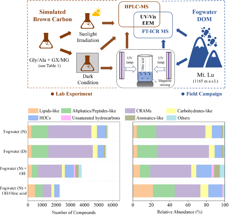 大气液相气溶胶的表面会包裹一层有机薄膜,通常是具有两亲性的表面活性物质,如不饱和脂肪酸。关于有机涂层与有机物之间的液相化学过程的研究仍然非常有限。本研究通过实验室模拟和外场观测的方式,分析了不饱和脂肪酸和雾水DOM之间的光化学过程。研究发现,油酸能够在三线态棕色碳组分(吸光性DOM)或OH自由基的诱导下,产生有机过氧自由基,进而通过双分子反应机制发生羟基化和多羟基化。同时,OH自由基可以加成到油酸的碳碳双键中产生克里奇中间体,然后通过界面反应被清除。FT-ICR MS的分析结果表明,在油酸和OH的共同作用下,雾水DOM发生了更加复杂的氧化过程。