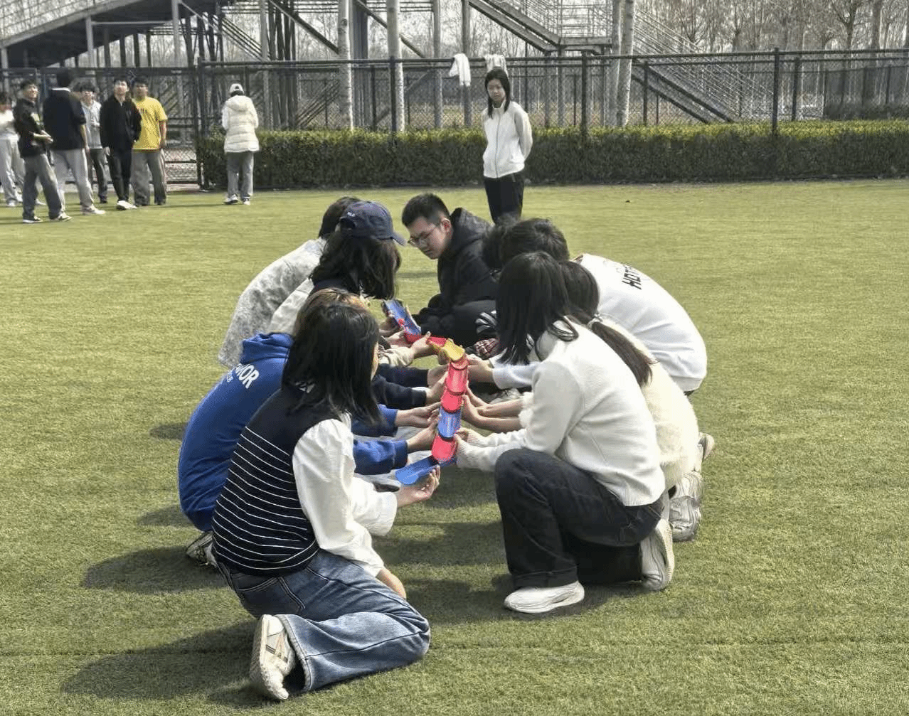 活动伊始,同学们在素拓教练的带领下迅速完成分组,通过趣味热身小游戏消解了最初的拘谨。随后,同学们开始完成核心团体项目:在“珠行万里”项目中,大家手持彩色管道,全神贯注接力传递小球,从最初的手忙脚乱到后来的默契配合,每一次成功抵达终点都伴随着热烈欢呼;在“同心鼓”项目里,数十根绳索牵引着同一面鼓,大家步调一致、齐心协力颠起皮球,在一次次起落中感受着团队协作的磅礴力量。
