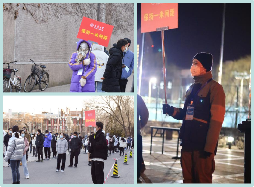 志愿者与学生骨干们共同努力,尽量减少同学们在寒风中的等待时间。志愿者的奉献精神也感召了更多的同学,同学们集合迅速,积极配合,第二次、第三次核酸检测顺利完成。