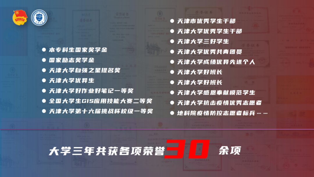 全面发展,他随队获得“唱响百年新征程”校合唱节二等奖,并作为队长带领学院取得王正廷杯综合运动会长绳比赛双校区第二名,他努力做不被定义的天大青年。