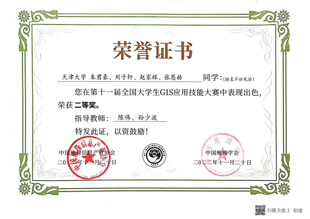 朱君豪,天津大学地球系统科学学院2020级本科生,中共党员,连续三年专业第一,目前已推免至北京大学攻读博士研究生。曾担任班级班长、天津大学学生体育总会团支书、天津大学学生会工作部门负责人等多项学生工作,获评本科生国家奖学金、国家励志奖学金、天津市优秀学生干部、天津大学自强之星提名奖等校级及以上荣誉30余项。
