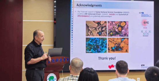 在本次研讨会上,Dani Or院士以《土壤细菌群落规模分布的一般规律》为题作开场报告,报告阐释了土壤细菌种群的群落规模分布及其相互作用距离,指出土壤细菌群落规模分布遵循吉布拉特定律,这一发现可为在完全充气土壤条件下,建立大细菌团簇启动缺氧代谢的条件提供依据,对于在后续研究中理解细菌群落的空间分布模式,解析微生态交换与功能至关重要。