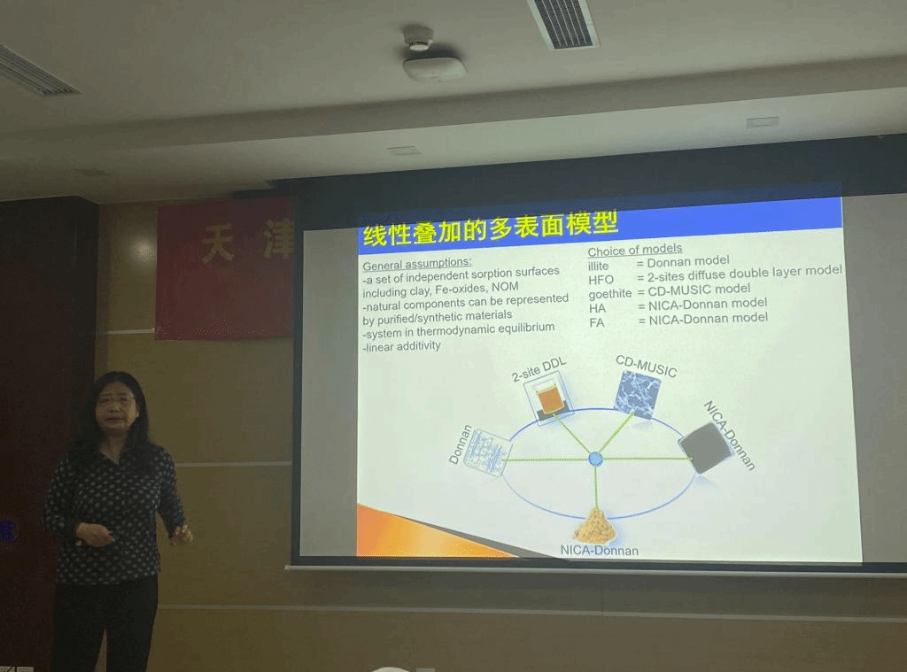 报告中,翁莉萍研究员系统介绍了土壤有机质(NOM)及来源、NOM-矿物的结合与碳稳定性、土壤腐殖酸特性和腐殖酸-铁氧化物-阴离子络合模型等内容。报告指出阳离子主要吸附在有机质上,由于土壤矿物表面有机质覆盖量高,大部分有机质在矿物的Stern层之外,因此阳离子吸附受矿物影响较小;而阴离子主要吸附在氧化物上,但有机质对其有竞争作用,且受有机质矿物影响大。结合土壤有机质、矿物、重金属化学形态研究中的大量典型案例,重点展示了其研究团队在表面络合模型(LCD model、NICA-Donnan model、CD-MUSIC model和NOM-CD model)应用于土壤阴离子和阳离子形态计算和线性叠加的多表面模型方面的最新研究成果。报告内容翔实、新颖,围绕“土壤有机质-矿物-重金属相互作用”议题与广大师生开展了深入的交流和热烈的讨论。