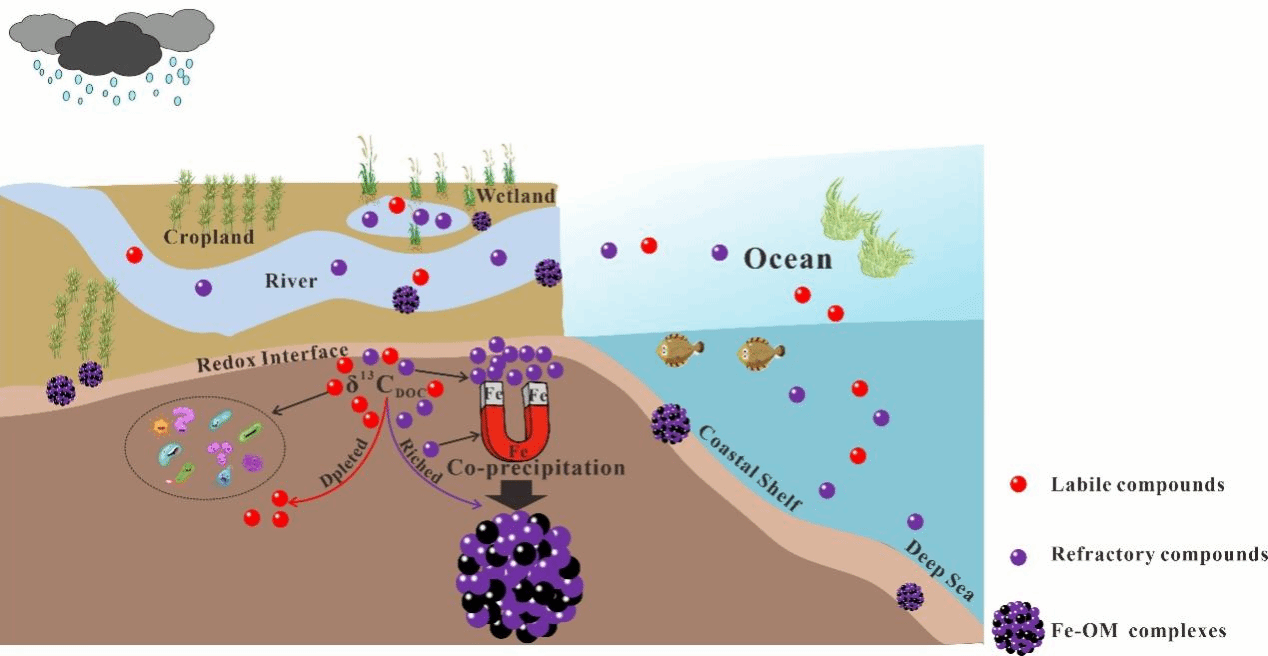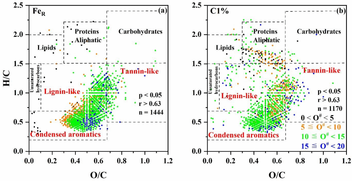 土壤中的活性铁氧化物能高效保护有机碳免受微生物降解,被认为是一种有效的“生锈的碳汇(rusty sink)”。然而,目前的研究大多局限于单一环境体系下铁氧化物与有机碳相互作用的模拟实验,缺乏对野外天然样品中铁结合有机碳的组成解析,也缺少不同环境体系下铁氧化物对有机碳选择性结合的研究,限制了学界对铁结合有机碳埋藏过程的进一步理解。