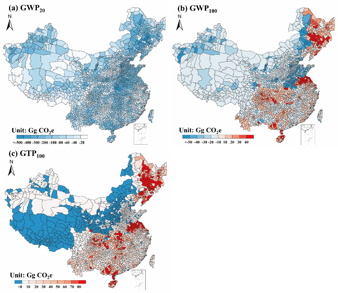 图2. 中国县域尺度农田气体活性氮排放气候效应