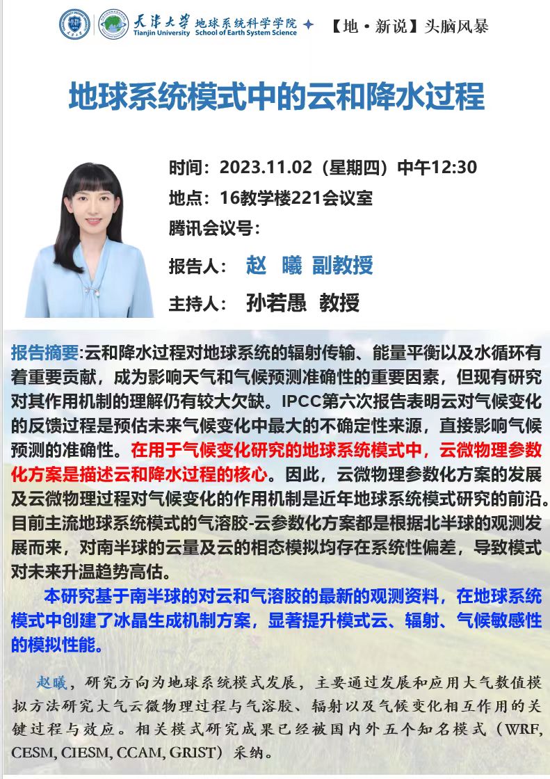 赵曦,研究方向为地球系统模式发展,主要通过发展和应用大气数值模拟方法研究大气云微物理过程与气溶胶、辐射以及气候变化相互作用的关键过程与效应。相关模式研究成果已经被国内外五个知名模式(WRE,CESM,CIESM,CCAM,GRIST)采纳。