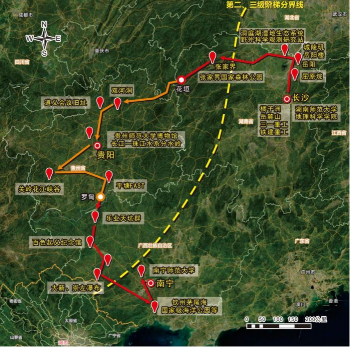 实习路线跨越湘黔桂三省,其中湖南段从长沙出发,途经洞庭湖区、张家界到花垣;贵州段从湄潭县开始,途经遵义、贵阳到罗甸;广西段从乐业开始,途经百色、钦州到南宁。实习总行程约2500公里。