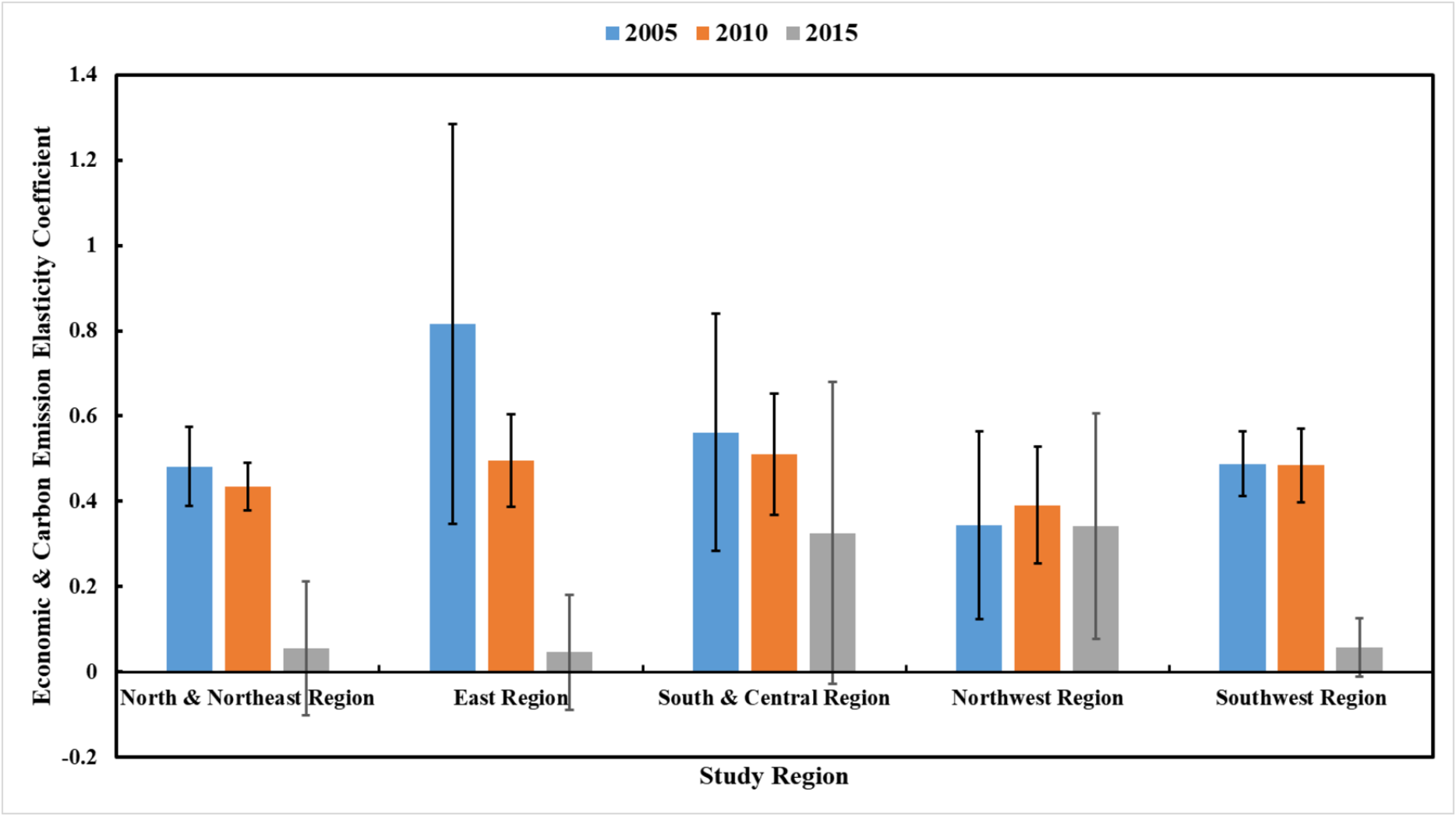 图4. 中国五大区域经济与碳排放弹性指数变化