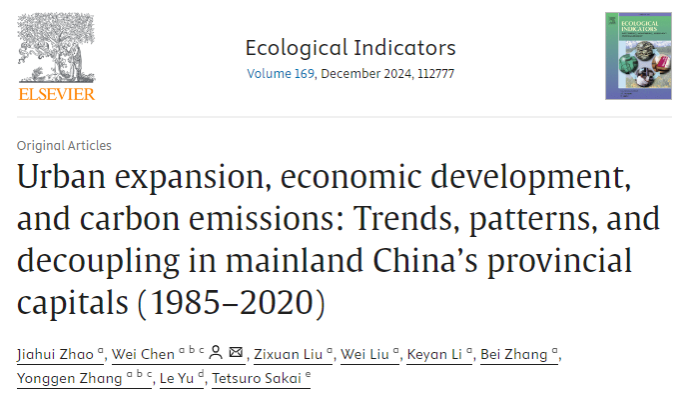 论文信息:Jiahui Zhao, Wei Chen*(通讯), Zixuan Liu, Wei Liu, Keyan Li, Bei Zhang, Yonggen Zhang, Le Yu, Tetsuro Sakai. Urban expansion, economic development, and carbon emissions: Trends, patterns, and decoupling in mainland China’s provincial capitals (1985–2020). Ecological Indicators, 2024, 169, 112777. 论文链接:https://www.sciencedirect.com/science/article/pii/S1470160X24012342