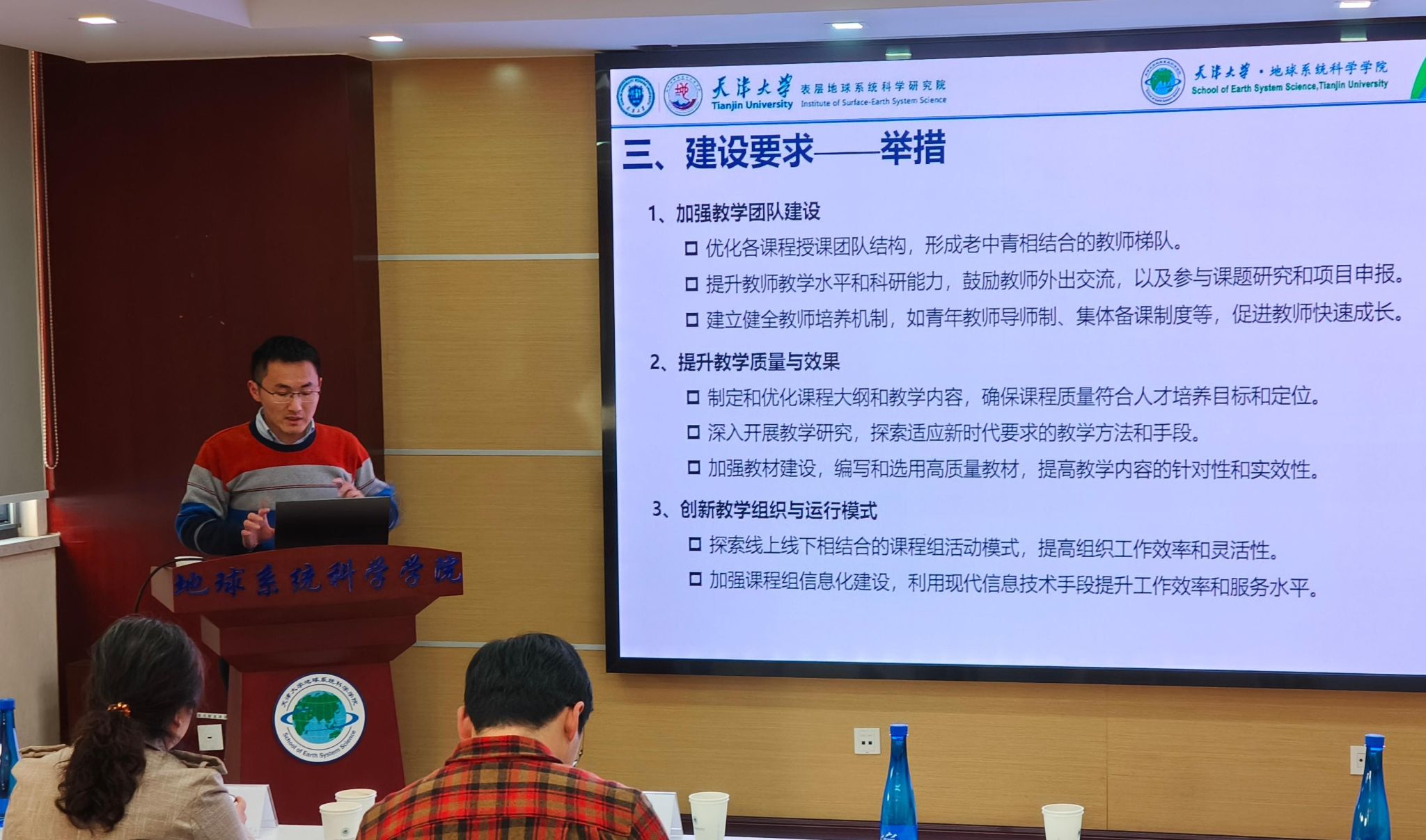 陈伟代表地理科学系介绍了专业课程组建设规划思路,就综合自然地理类、地质与地化类、数据与地理信息类这三个课程组的团队建设、质量保障、运行模式等方面作了说明。