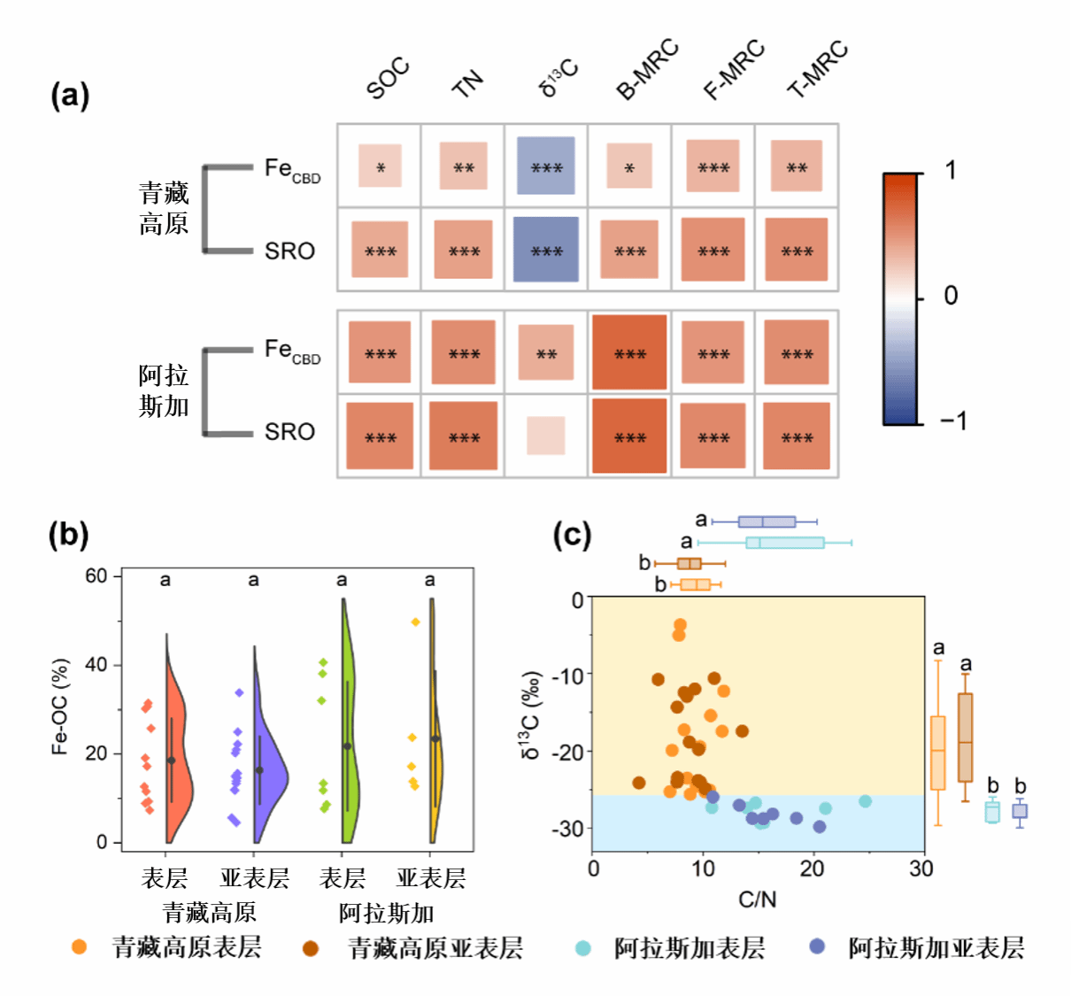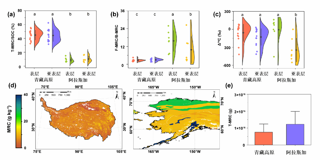 研究结果显示,青藏高原冻土中微生物残体碳占比高达44%,而阿拉斯加地区仅为10%左右,这一显著差异揭示了微生物残体碳对土壤有机碳稳定性的重要贡献。此外,论文还发现阿拉斯加冻土的过氧化物酶活性比青藏高原土壤高一个数量级,这为理解永久冻土碳不稳定机制提供了全新视角,凸显了高纬度永久冻土中老碳面临的碳排放风险。研究结果不仅为冻土碳循环领域提供了关键的科学数据,更为全球气候变化背景下冻土碳释放风险评估和预测模型的构建奠定了坚实基础。