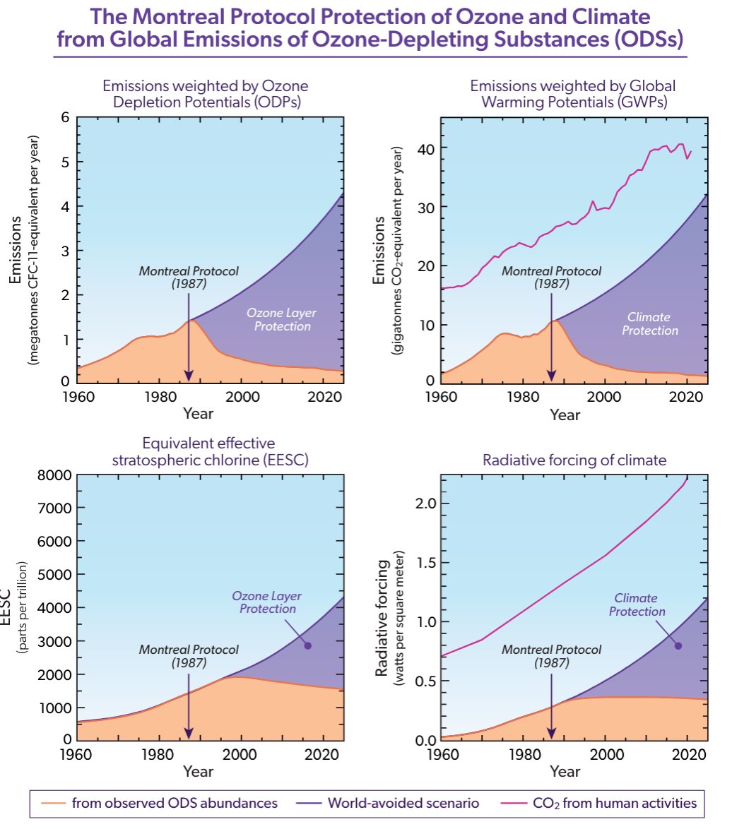 (图2)《蒙特利尔议定书》的环境气候效益(臭氧层空洞科学评估报告:2022)