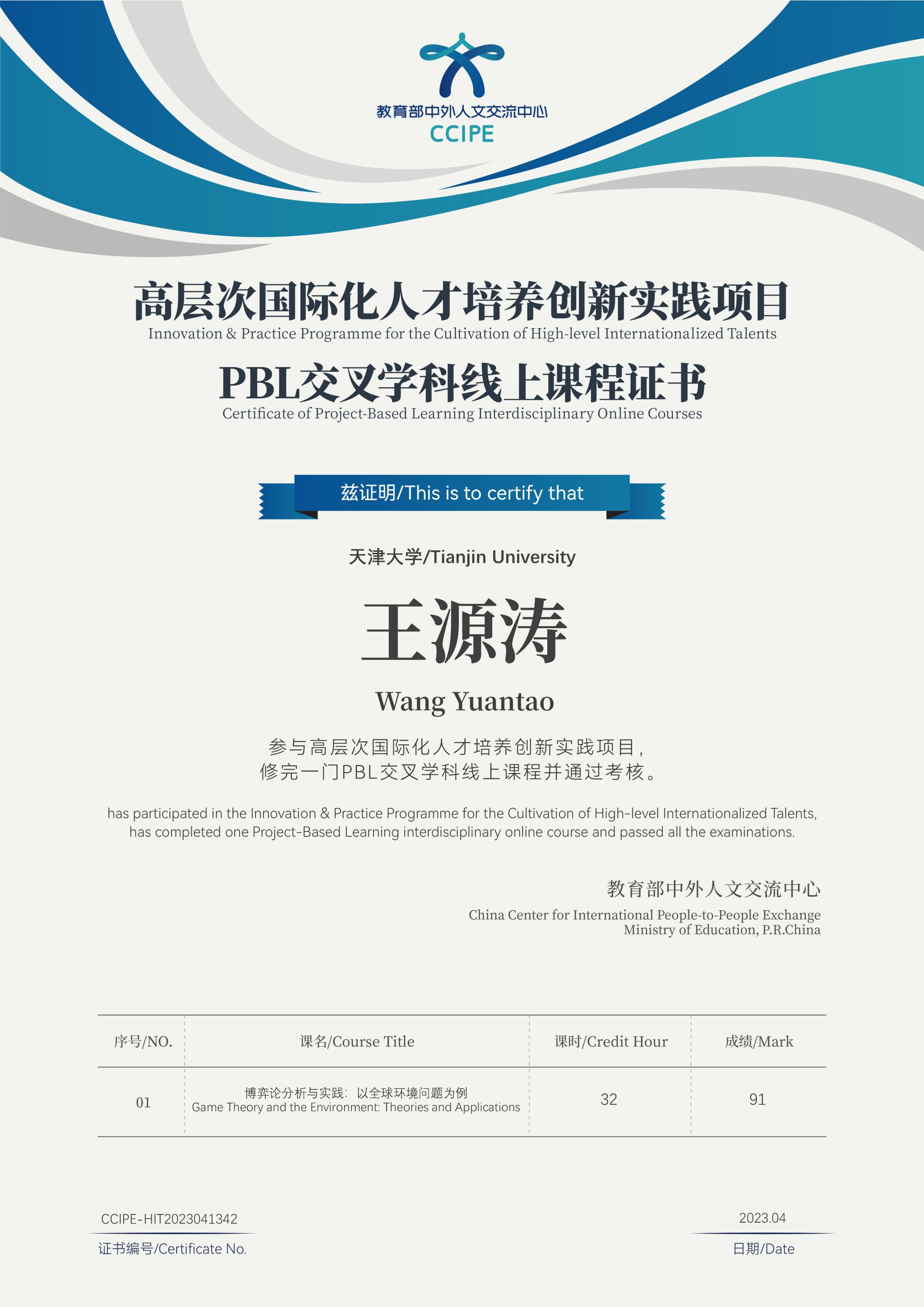 (图3)参加高层次国际化人才培养创新实践项目课程证书