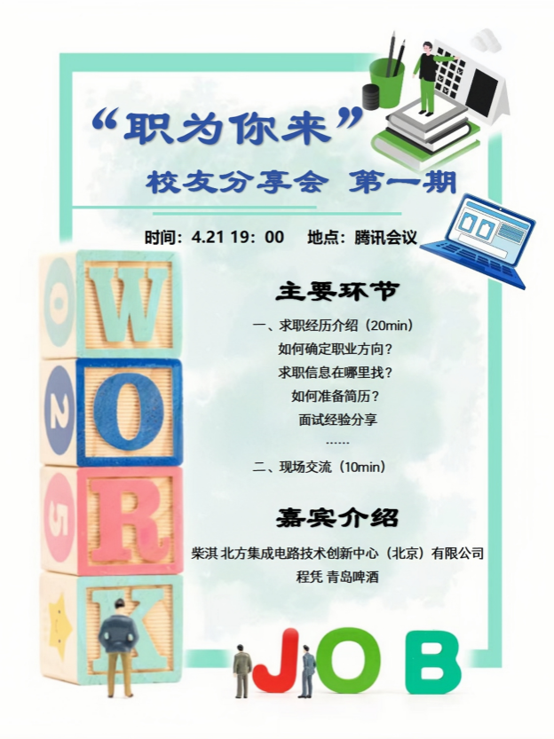 学院举办“职为你来”校友分享活动,邀请校友代表、优秀毕业生为同学们分享心得、求职经验和择业观,为学生在校期间的学业、毕业以及求职准备提供宝贵意见建议。4月21日已成功举办第一期,预计共四期。