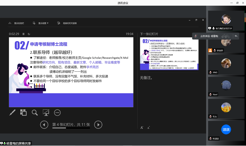 为充分考量同学们的就业需求,本次分享会邀请了四位不同毕业去向(读博深造、选调生、事业单位、国企)的2021届优秀毕业生向大家分享就业经验。杨雪梅为大家详细介绍了读博申请机制,提出申请读博需要注意的关键问题;黄舒为大家分享选调生学习经验;张旭龙就求职准备及应聘经验向大家做详细介绍;石文豪给大家带来国企相关工作的就业经验分享。通过本次校友分享,为即将进入求职季的同学们提供宝贵的求职经验,助力各位同学以饱满的热情和信心迎接未知挑战,在未来的求职季中都取得一份自己心仪的工作。
