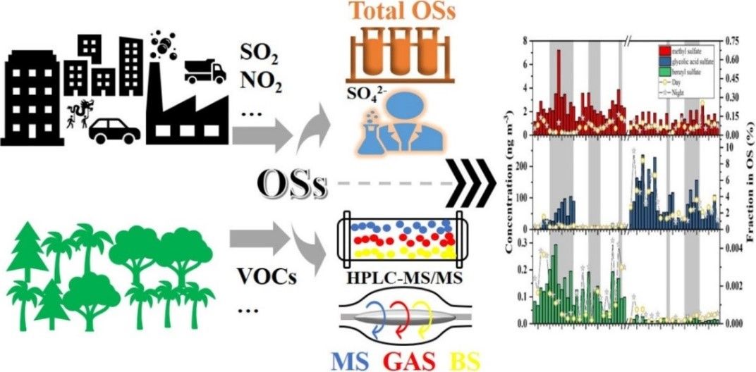 有机硫酸脂(OSs)是挥发性有机化合物对硫酸盐气溶胶的反应性吸收的产物,是一种重要的人为影响下生物源二次有机气溶胶生成的示踪剂。对OSs的定性及定量分析不仅可以为二次气溶胶含量的模型模拟提供数据支撑,还可以帮助分析潜在的大气物理和大气化学过程并理解人类活动对生物成因二次有机气溶胶形成的影响。本研究通过应用HPLC-MS/MS建立多种OSs检测方法,研究将OSs总量分析与典型OSs进行结合,对OSs时空分布特征和形成机制进行深入的分析。