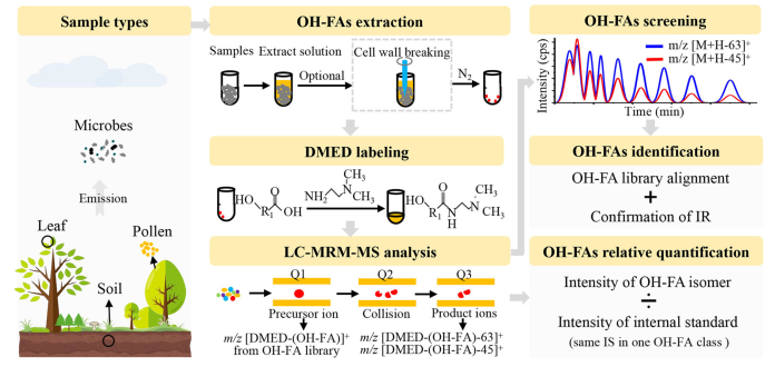 本研究使用 N,N-二甲基乙二胺(DMED)标记与超高效液相色谱-质谱(UPLC-MS)相结合的分析方法,在多反应监测模式(MRM)下,对不同的界面环境样品中(土壤、叶片、花粉和大气微生物)OH-FAs(C8-C18)的位置特异性异构体进行了筛选、鉴定和定量。通过该方法,从界面环境样品中成功检测并注释了共 94 种 OH-FAs 的位置特异异构体,其中 38 种异构体通过标准物得到了进一步确认。本研究为获得详细的脂质生物标志物谱提供了方法学支撑,并有助于日后进一步研究生物及其代谢物在复杂环境基质中的迁移过程。