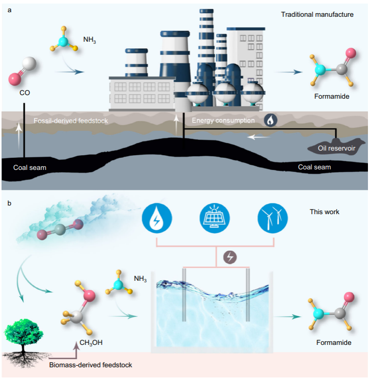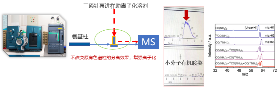 电化学技术,特别是由可再生能源驱动的电化学技术,在合成许多高价值化学品方面越来越受到关注。酰胺是化学和生物学中一类非常重要的化合物,在过去的一个世纪里得到了广泛的研究。仅甲酰胺一项每年就拥有数百万吨的全球市场,甲酰胺传统制备方法消耗了大量的化石燃料并加剧了温室效应,电化学转化可将富含碳和氮的小分子转化为高价值的有机氮化合物可减少对化石能源的依赖。本研究中报道单电池电化学氧化法将甲醇和氨转化为甲酰胺,提供了一种通过C–N偶联合成甲酰胺的方法。在制备产物甲酰胺的定性鉴别中,应用UPLC-PDA-MS,在不改变氨基柱的分离效果的前提下,通过三通针泵进样助离子化试剂,提高产物的质谱响应,同步得到产物中甲酰胺的光谱和质谱特征,可辅助产物定性确证,成为小分子有机氨类化合物有力的定性手段之一。