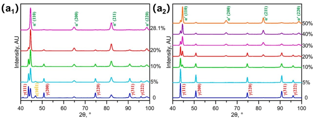 1) 利用XRD表征304奥氏体不锈钢在低温循环塑性强化过程中的物相变化,发现经过强化处理后,304奥氏体不锈钢中形成了α′-马氏体颗粒。这种微观结构使金属材料在拉伸过程中实现了动态应变分配(dynamic strain partitioning)现象,提高了材料的整体力学性能。