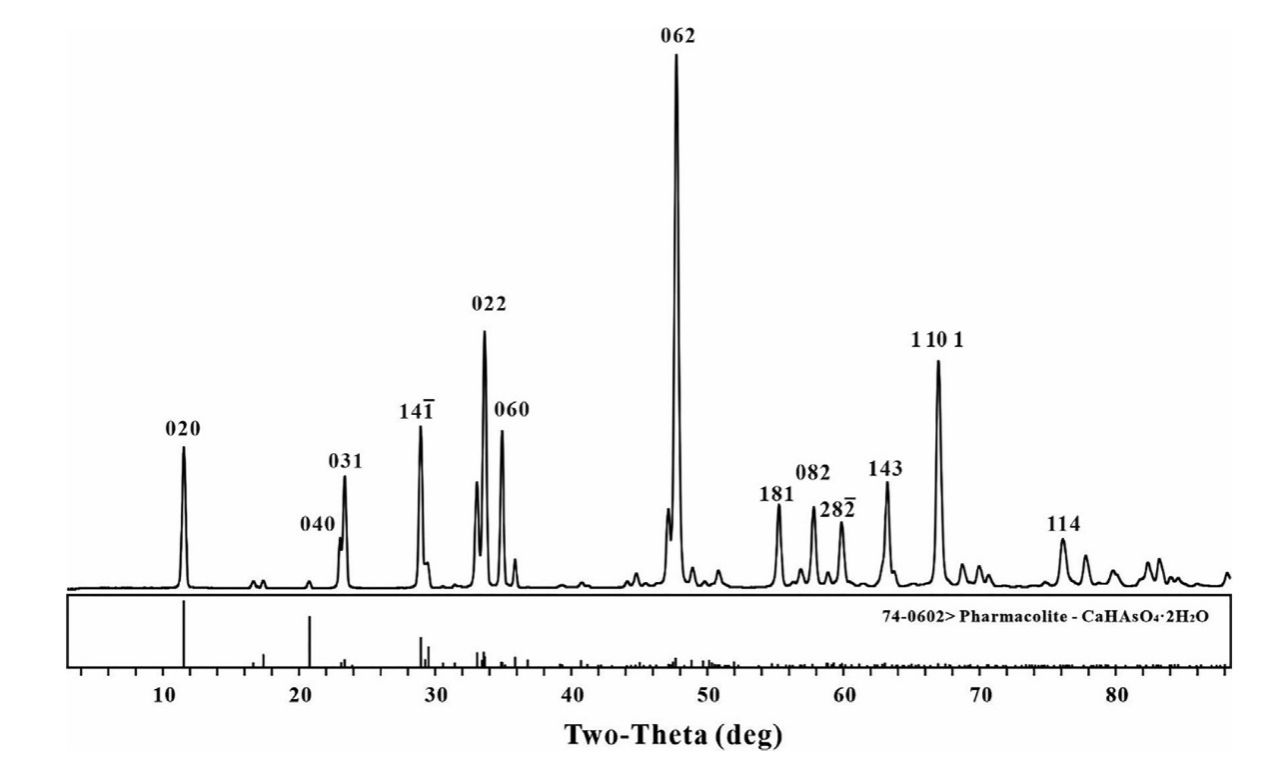 2) 使用XRD表征在石膏衬底上液相沉积的pharmacolite晶体,进行物相鉴别,证实该晶体存在,并进一步探索其成矿过程和机理。