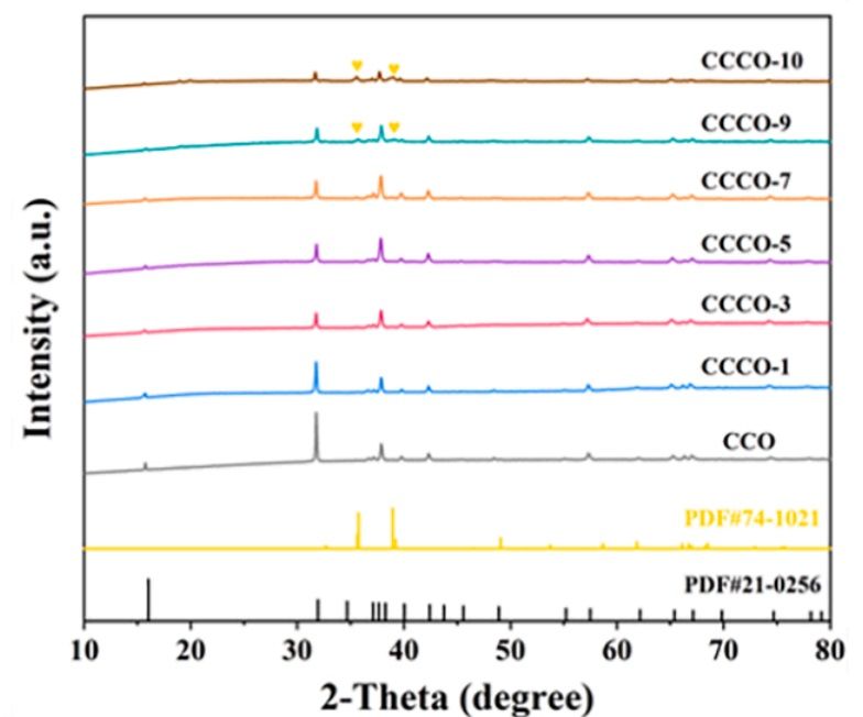 通过采集掺杂Ce的CuCoO2的X射线衍射谱,表征不同掺杂浓度对CCO晶体结构及物相变化的影响,助力研发有机污染物高效催化剂。