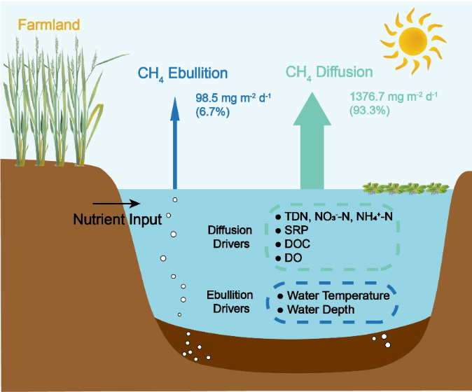 大量的养分输入刺激了农田沟渠水体中甲烷(CH₄)的产生与排放,是重要的CH₄来源。本研究通过气相色谱分析仪(GC)对甲烷含量进行检测,观测发现,在农业沟渠系统中,CH₄排放贡献了温室气体全球增温潜势(Global Warming Potential, GWP)的86%,其中81%来自于扩散排放,5%来自于冒泡排放。研究强调了农业沟渠作为CH₄热点来源的重要性,尤其是其中扩散排放途径起到的主导作用。