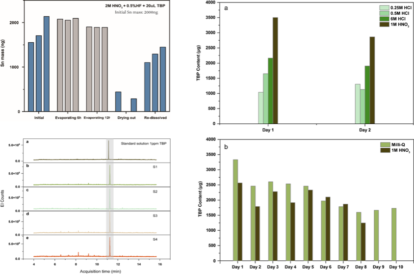 萃淋树脂是金属同位素化学纯化前处理的重要工具,广泛用于高精度金属同位素分析测试的化学前处理流程中。然而,我们在使用TRU萃淋树脂分离纯化锡(Sn)的金属同位素过程中,通过气相色谱-四极杆串联飞行时间质谱(GC-QTOF/MS)对淋滤液中的有机质成分进行定量测试,发现其负载的主要工作成分TBP(Sn的萃取剂)成分始终会在树脂工作过程中大量进入洗脱液,存在系统性缺陷且无法通过简单的预清洗处理解决,严重影响金属同位素测试准确性和精确度。基于此,实验室完成了稳定、高效的Sn同位素化学分析纯化方法。新方法可以在不使用双稀释剂校正技术的情况下,精确、可重复的测试样品中Sn同位素比值,为后续更广泛的Sn同位素应用奠定了技术基础。